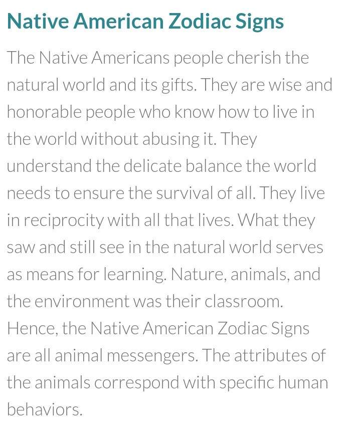 Native American Zodiac - SunSigns.Org The Native Americans developed a system of earth-based astrology. There are 12 signs in the year each named after a specific animal. These would be the animal guides that we often hear of in relation to the North American natives. Not only do the animals representing the signs guide, but they also teach some of the essential lessons of life.